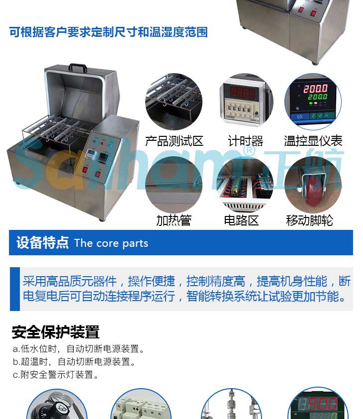 產品特點:蒸汽老化試驗機老化箱整體不銹鋼SUS #304 HL制成,操作設定簡易 微電腦數位LED控制,具時間規劃功能,可在0~9,990Mins間設定。 多重超溫保護/缺水切電熱等安全裝置。 零件、連接器被動元件,半導體接腳高溫高濕氧化試驗。 金屬接腳沾錫性試驗加速老化試驗。 采用觸摸式PID+SSR 溫度控制器,同時具有時間計時功能,可設定9990 分式無限。 全自動安全超溫保護及氣用水缺水空焚保護裝置。 | |